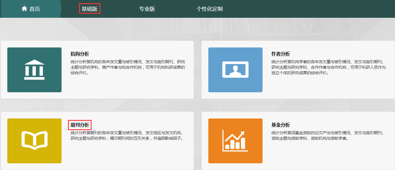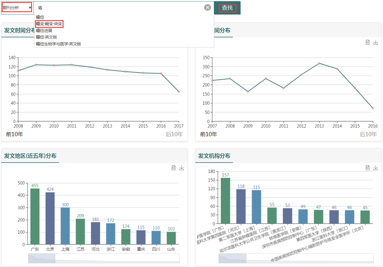 针对某期刊的各年发文量与被引情况、发文地区与发文机构、研究主题与研究学科分布情况进行统计分析,揭示期刊间的互引关系,并追踪影响因子,能为用户提供全面翔实的期刊内容和被引情况统计,表征期刊论文的水平和学术影响力,可用于医学核心期刊的筛选与评价,其中默认展示刊载文献总量及总被引频次排名前30的期刊名称及其发文数和总被引频次,且点击期刊名称可查看其在基础版的各项分析结果。 在查询框中输入期刊名称片段,基于期刊规范数据页面自动弹出一个查询提示框,在其中选择相关期刊名称后点击查找按钮,即可显示相应的统计分析结果。可通过时间窗,选择查看不同时间段研究主题、研究学科的统计结果。 例如:查看期刊《癌变.畸变.突变》上刊载文献的统计情况,可进行如下操作: 第一步:在“首页”,点击“期刊分析”进入分析页面,或点击“基础版”进入机构分析页面,然后再选择期刊分析。