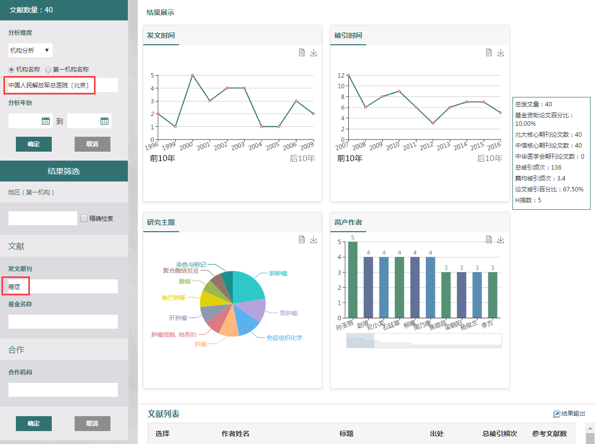 在左上角查询框中输入机构名称片段,然后在弹出的提示框中选择相关机构名称进行分析。此外,可自由限定分析年份,同时可在结果筛选区域的地区、期刊、基金及机构查询框中输入相应查询词并在弹出的提示框(地区除外)中选择相应筛选项来了解指定机构在某期刊、受某项基金资助、与某地区机构合作、与特定机构合作的发文情况,其中默认展示总发文量排名前30的机构名称及其发文数和总被引频次,且点击机构名称可查看其在专业版的各项分析结果。例如下图展示的是中国人民解放军总医院在癌症期刊上的发文统计情况及详细发文列表。
