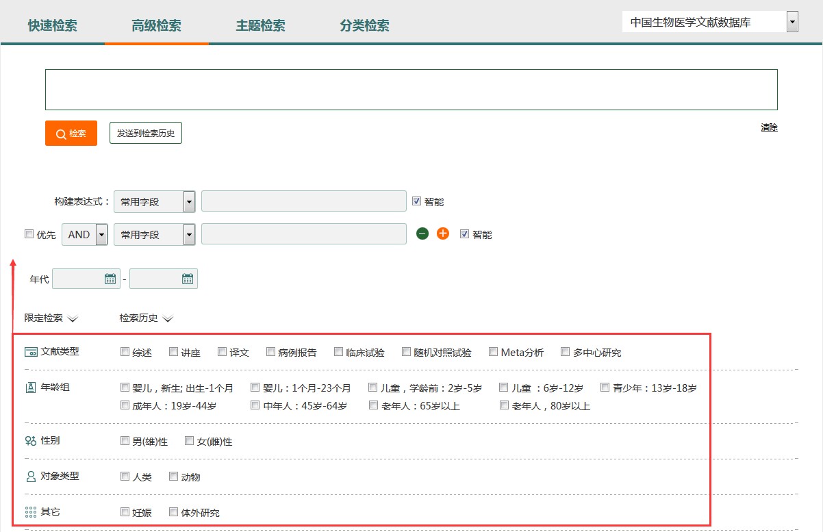 限定检索把文献类型、年龄组、性别、对象类型、其它等常用限定条件整合到一起,用于对检索结果的进一步限定,可减少二次检索操作,提高检索效率。一旦设置了限定条件,除非用户取消,否则在该用户的检索过程中,限定条件一直有效。