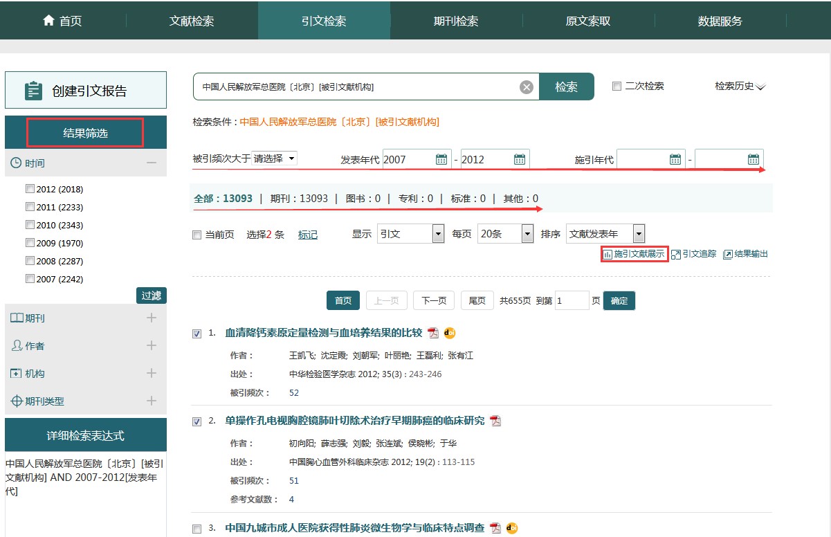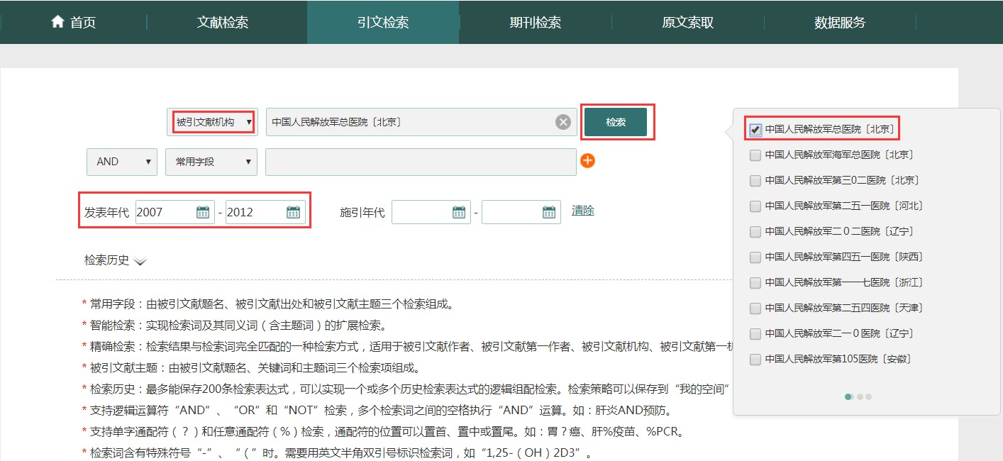 引文检索支持从被引文献题名、主题、作者/第一作者、出处、机构/第一机构、资助基金等途径查找引文,帮助您了解感兴趣的科研成果等在生物医学领域的引用情况,针对被引文献作者、机构、出处、资助基金检索项增加智能提示功能。同时,支持发表年代、施引年代的限定检索,亦支持对检索结果从发表时间、期刊、作者、机构、期刊类型维度做进一步聚类筛选。 如以检索“中国人民解放军总医院于2007-2012年间发表文献的被引用情况”。您只需进行如下操作: 进入引文检索页面,检索入口选择“被引文献机构”,输入“人民解放军”,在弹出的提示框中选择“中国人民解放军总医院〔北京〕”,在发表年代处选择“2007”和“2012”,点击“检索”,即可查看到所需结果。