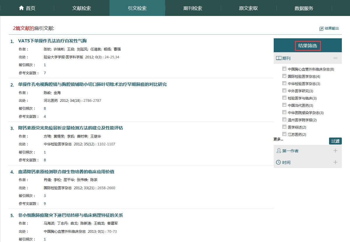 可对检索结果进行多维聚类筛选和限定。同时,方便用户查看其中一篇或多篇文献的施引文献,系统将对重复施引文献进行自动去重,并支持对施引文献从发表期刊、第一作者、时间三个维度进一步筛选过滤。