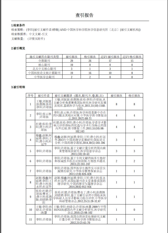 Tips:引文分析报告由检索结果集发文和被引时间分布、引证综合指标统计及论文近5年被引情况统计三部分组成。 h指数:是基于“论文历年被引情况”表中“总被引频次”降序排序的文献列表。其含义为检索结果集中有N篇文章至少被引用了N次,N即为h指数。此度量标准减少了为高度引用或尚未被引用论文分配的不当权重。h指数值的计算仅包括CBM数据库中的项目,不包括未收录期刊中的论文和图书专著等。 论文近5年被引情况:按照引文近5年总被引频次大小降序排列。表中的“年均引用频次”表示引文自发表后的年均被引频次(计算公式为=总被引频次/已发表的年代数)。选择记录前面的复选框时,可以只保存标记记录的引文分析结果。 Tips:查引报告包括查引检索条件、被引概览、被引明细及附件4部分组成,由点击“引文报告”页面右上角的“查引报告”按钮即可一键式生成。其中,他引频次表示去除单篇论文全部作者以外其他人发表文献引用次数之和。