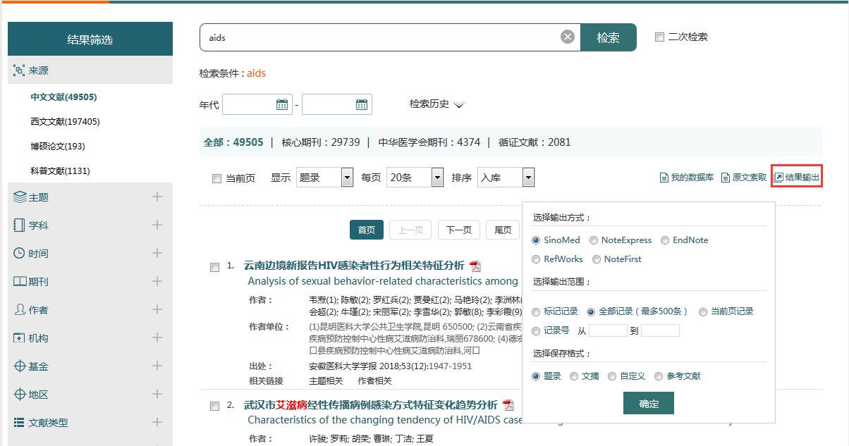 在检索结果页面,用户可根据需要选择输出检索结果,包括输出方式、输出范围、保存格式。输出方式有:SinoMed、NoteExpress、EndNote、RefWorls、NoteFirst。