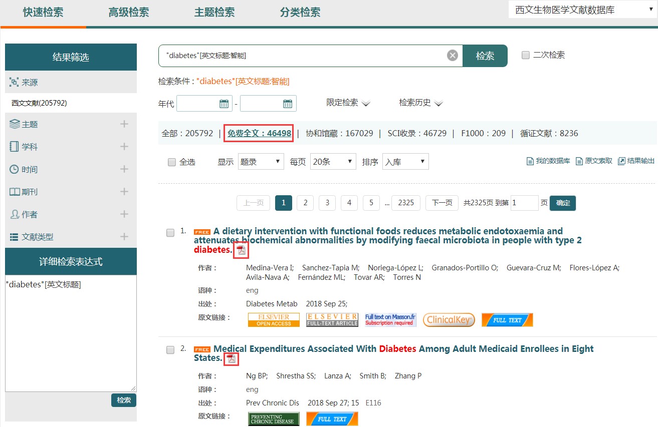 (3)西文生物医学期刊文献全文:为帮助用户方便快捷地查找、利用互联网免费西文期刊文献,SinoMed对网络生物医学免费期刊及其文献进行了全面系统的整理。进入WBM检索结果页面,点击“免费全文”分类导卡,用户可以快速、准确地查找免费期刊文献线索并获取全文。