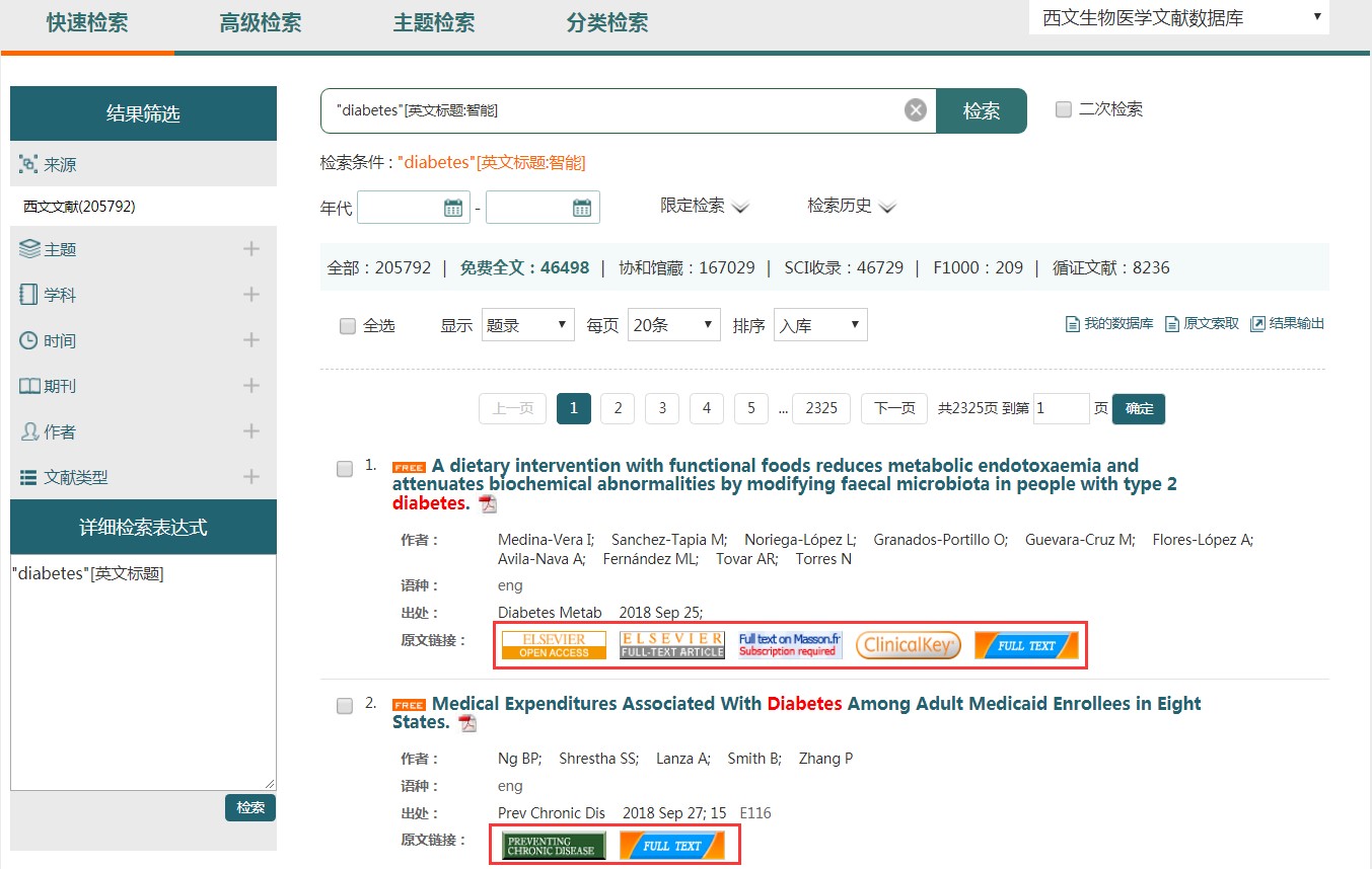 SinoMed的全文有三类:中文期刊文献全文、北京协和医学院博硕学位论文全文和西文生物医学期刊文献全文: (1)中文期刊文献全文:若贵单位订购了维普中文数据库,您可以利用SinoMed提供的维普中文全文链接功能获取中文期刊文献全文。此外,对于部分中文期刊文献,也通过DOI链接至万方医学网、万方知识服务平台或编辑部网站进行全文获取。